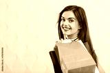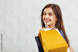 Young beautiful girl with great smile wears white scirt holding shopping colorful bags on isolated background, shopaholic concept
