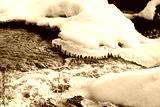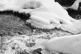 Snow covered rocks forming icicles over flowing stream, frozen water creating natural winter landscape with visible ice formations and partially submerged stones in cold environment