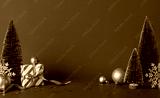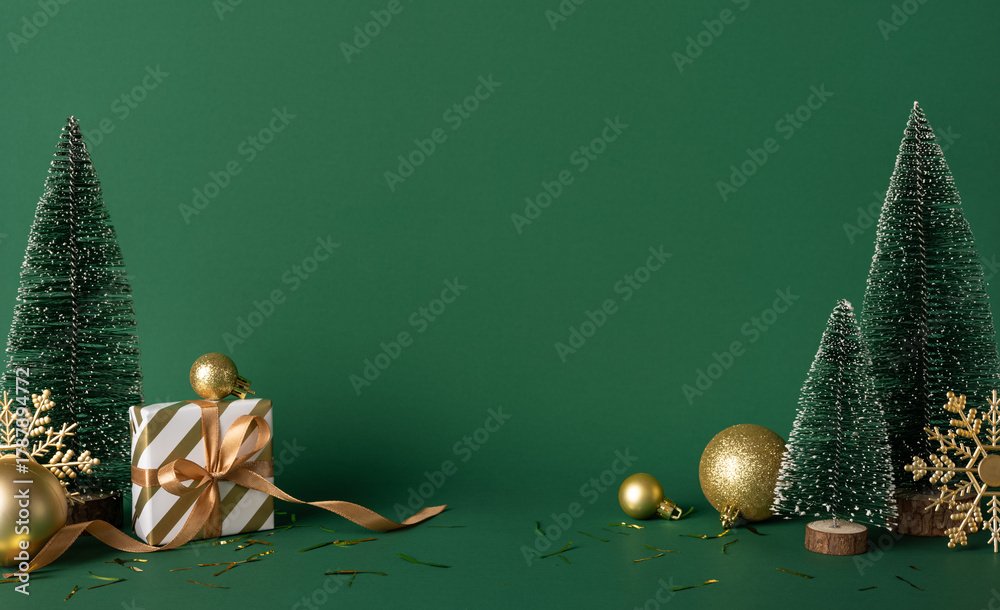 Green backdrop Christmas scene with gold gifts ornaments ribbons warmth joy greeting festive mood