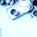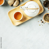 Minimalist Herbal Tea Flat Lay with White Teapot and Ginger
