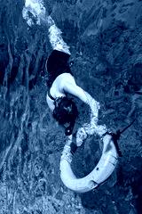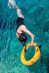 A woman looks at the underwater world with her head water and holding onto a lifebuoy.