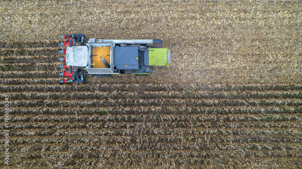 Prace polowe. Żniwa, ścinanie kukurydzy kombajnem na polu w Polsce jesienią z lotu ptaka.