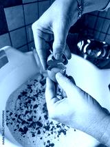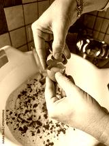 a hand breaking an egg into a plastic bowl filled with spices, sugar and flour for making weihnachtsstollen, Christmas stollen, a typical German or Austrian Christmas pastry.