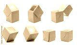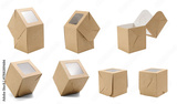 Few various brown paper boxes with transparent window on lid at various angles on white background