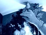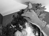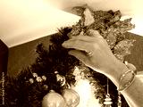 A white man's hand hangs a glass Christmas decoration in a garland, a Christmas decoration in a house, on the ceiling. A cozy decoration for the end of the year.
