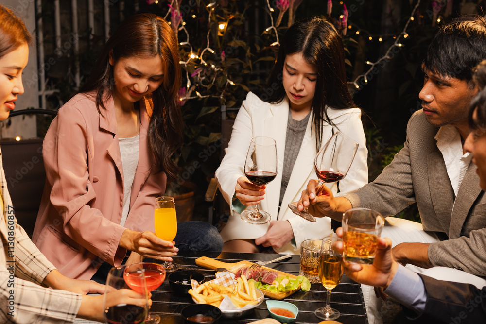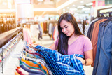 Happy young asian woman checking a price tag on shirt in mall or clothing store.