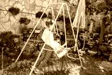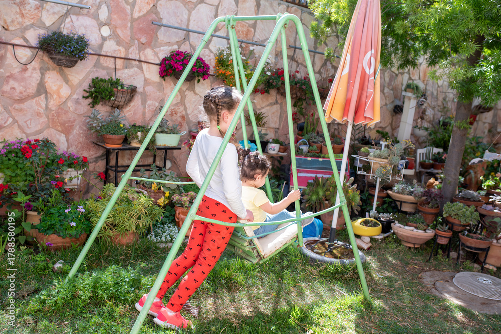 In a colorful backyard garden, two children enjoy swinging on a green swing set surrounded by blooming flowers and plants in terracotta pots. The sunny day brings joy to their playtime.