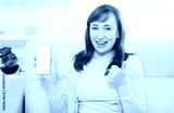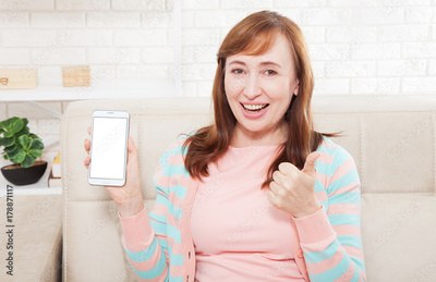 Female hand holding white phone on white clipping path inside at home background. Middle age woman. Copy space and mock up. Happy person, thumb up