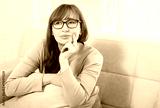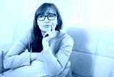 Lovely middle-aged brunette woman with glasses and smile sitting on sofa at home background. Menopause and mothers day. Mock up and copy space