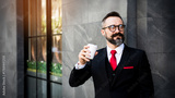 Businessman holding a cup of coffee, serious and anxious face in the business crisis and economic situation.