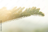 Dewdrops delicately hang from vibrant green pine needles, capturing the serene morning atmosphere The natural scene reflects tranquility and freshness. After rain atmosphere
