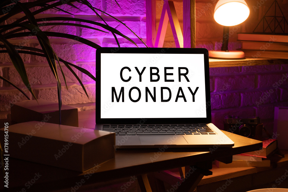 Laptop with a words cyber monday written on screen stand on wooden table surrounded by cardboard boxes next to wooden shelf and flowerpot, illuminated by desk lamp and neon light in evening room.