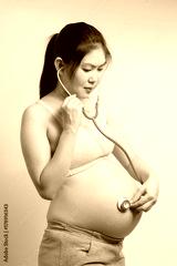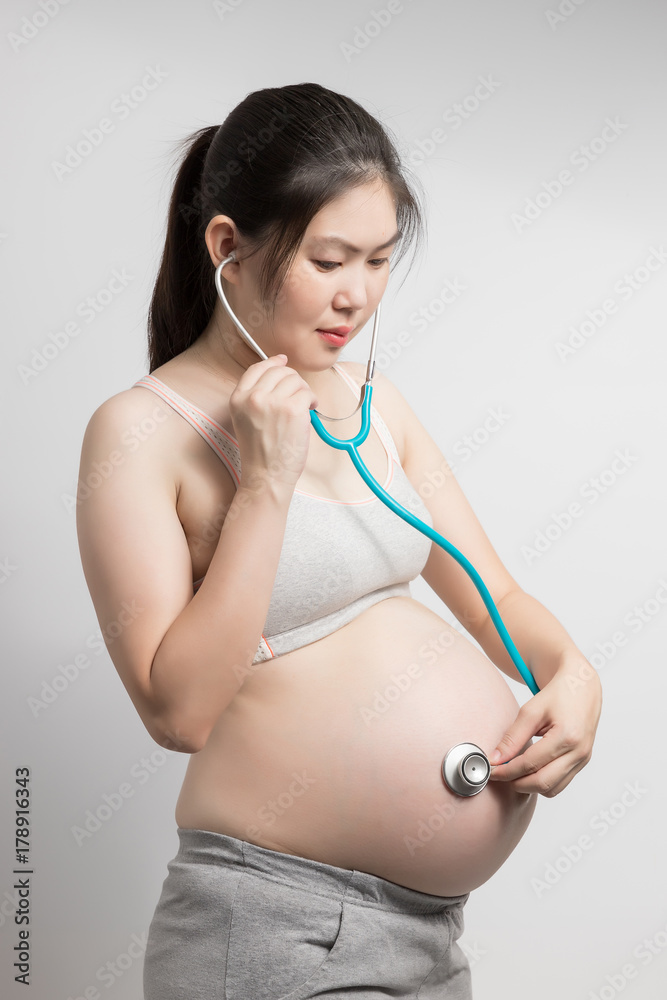 Beautiful pregnant asian woman in grey underwear using stethoscope examining on her baby in her belly.