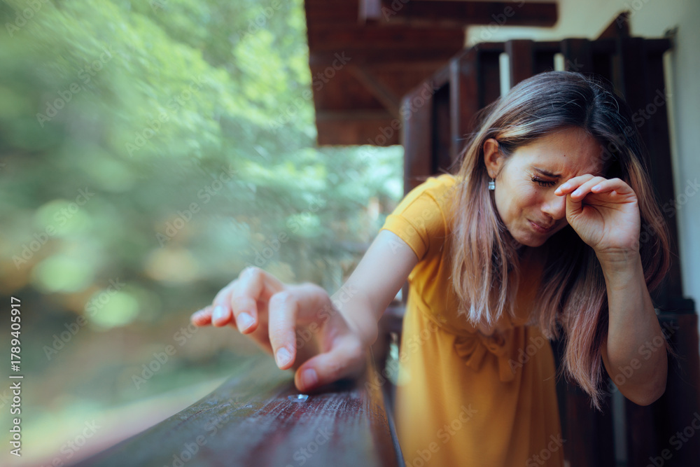 Woman Loosing a Contact Lens Trying to Recuperate it. Unhappy woman losing her contact lenses on the balcony