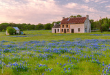 An old rustic house sits nestled in a field of bluebonnets in Marble Falls, Texas