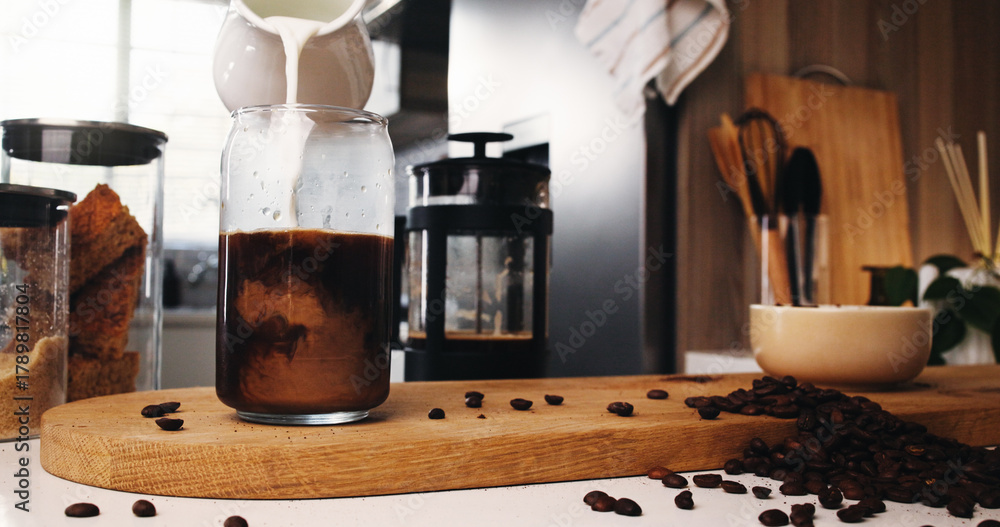 Pouring, cream and ice coffee in kitchen, beans and ingredients for caffeine beverage, milk or latte. Breakfast, cold brew and liquid with antioxidants in glass, grain and process for drink in house