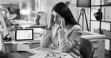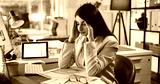 Headache, computer and business woman in office for account mistake, overworked and brain fog at night. Bokeh, frustrated and broker deadline with person in finance agency for burnout and stress