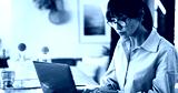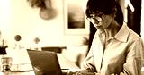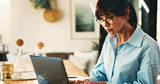 Laptop, typing and woman in home office as freelancer, reading research or review ebook. Computer, remote work and mature author in house for planning story, editing manuscript and publication email