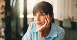 Daydreaming, writer and woman in home, creative and inspiration for article, thinking or remote work. Happy, journalist and mature person with ideas for freelance project, reflection and planning