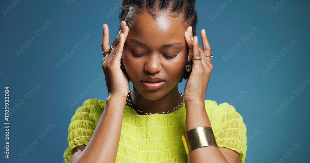 Stress, pain and black woman in studio, headache and overwhelmed on blue background. Space, migraine and African person with burnout, health risk and pressure with anxiety, tired and brain fog