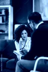 Woman in Therapy Session With Counselor Taking Notes in Cozy Office Setting During Evening Visit
