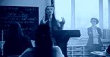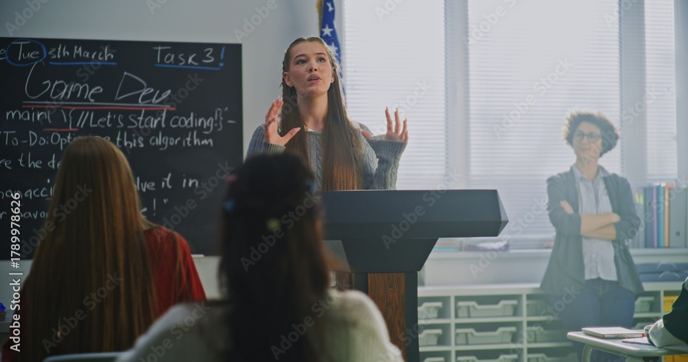 American Teenage Girl Delivers Expressive Speech in Front of Classmates, Gesturing Confidently With US Flag. Concept Civic Education, Confident Communication, Active Student Participation. Dolly Shot.