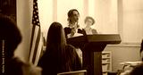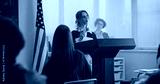 American Female Student Delivers Speech With US Flag in Front of Classmates Sitting Desks. Concept Civic Education, Public Speaking Skills, and Student Voice in American Education System. Dolly Shot.