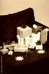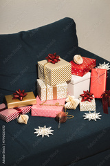 Many Christmas gifts on blue sofa