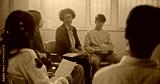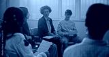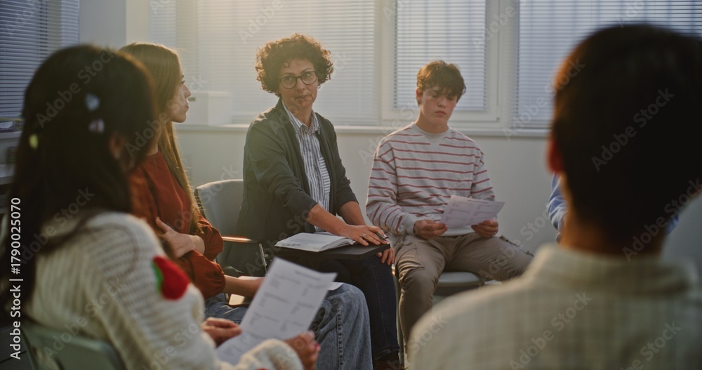 Adult Female Teacher Distributes Questionnaires and Asks Students to Complete State Trait Anxiety Inventory. Open Communication, Mental Health Education, Learning to Assess Anxiety Levels. Dolly Shot.