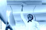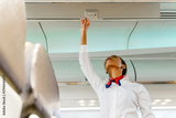 Flight attendant in uniform reaches to adjust an overhead panel inside a modern airplane cabin during preflight checks. Inflight cabin airline service business concept