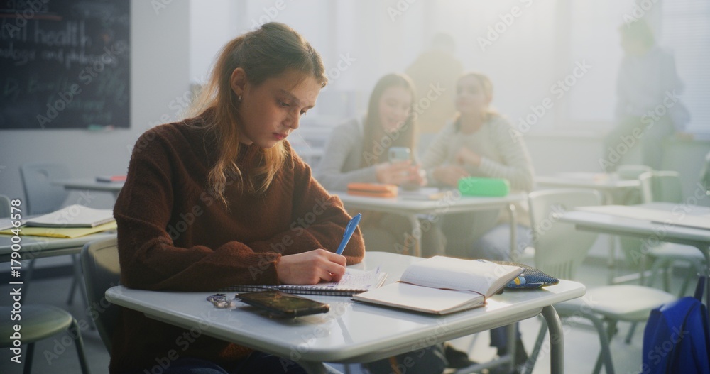 Sad Teenage Girl Sits Alone at Desk, Looking Down Notebook While Classmates Laugh and Chat in Background. Concept Loneliness, Emotional Well Being, Social Isolation in Modern Environment. Dolly Shot.