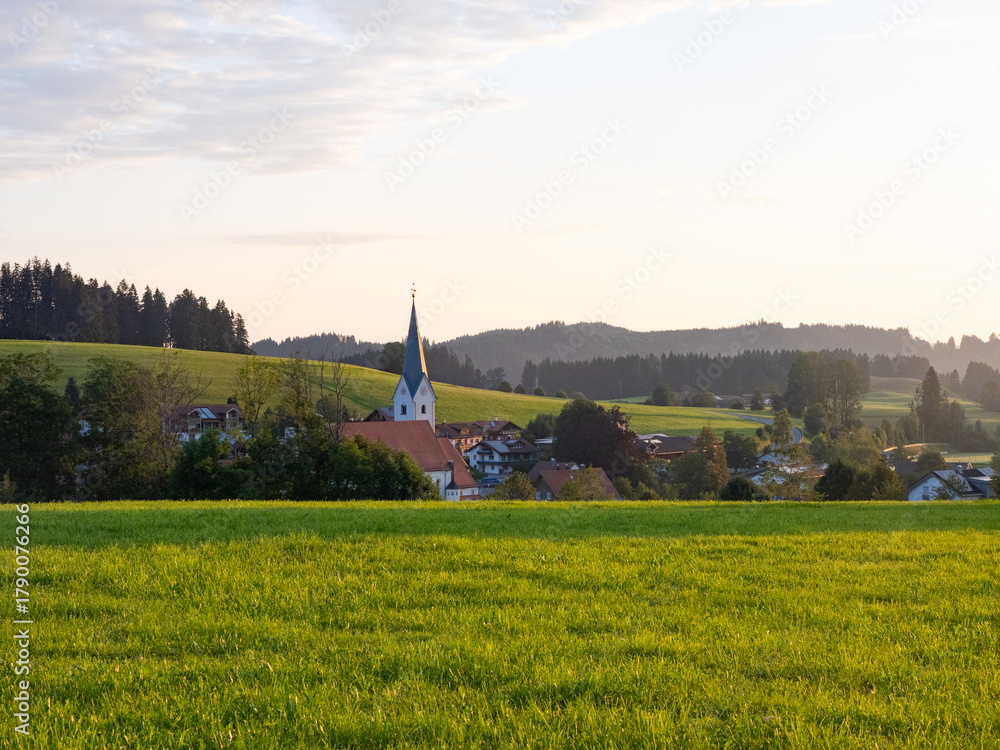 Stiefenhofen, Germany - July 21st 2024: Morning view of the village with church surrounded by hills
