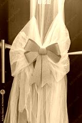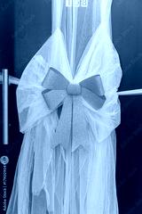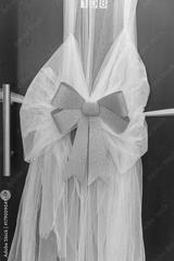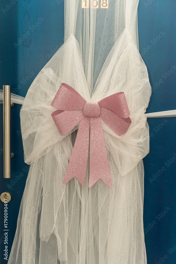 Soft white fabric with a big pink glitter bow adorns a blue door, creating a charming and festive atmosphere for a wedding celebration. Perfect for welcoming guests.