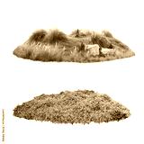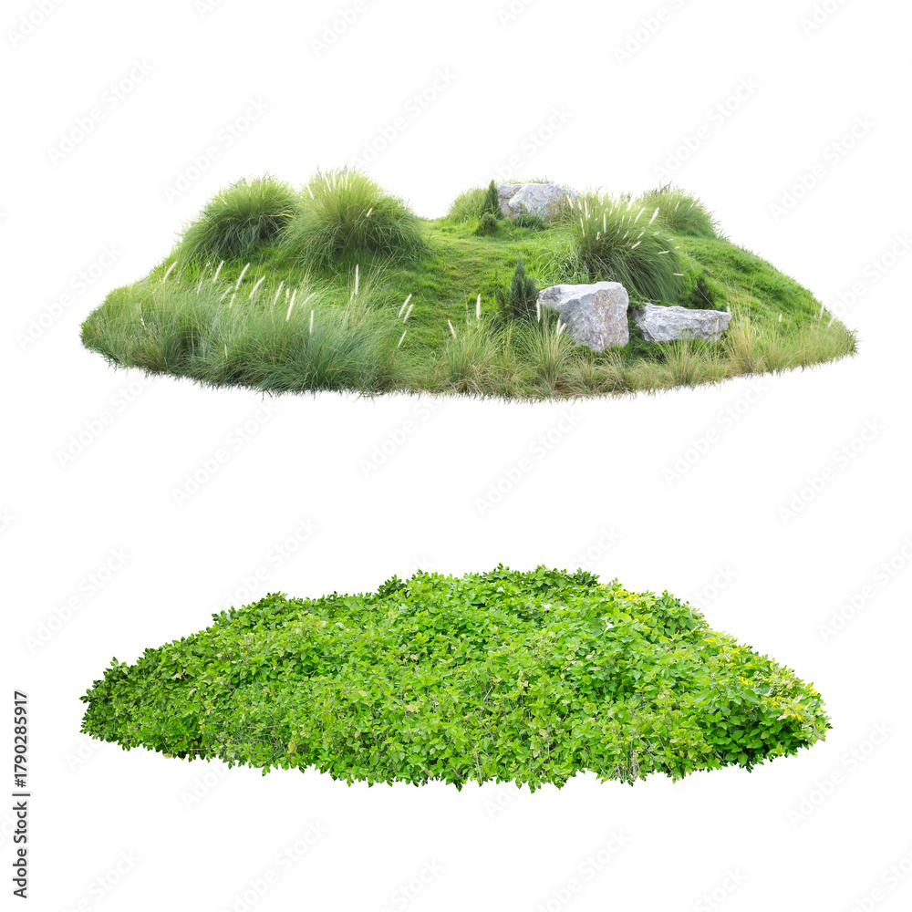 Collection of green trees. Stone garden decoration and shrubs isolated on white background. clipping path. designed for plans architectural layouts, ideas for garden and environmental elements.