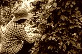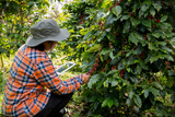Farmer concept harvest hand ripe coffee seed robusta arabica berry close up fresh green leaf bean picking orange crop red yellow berries raw plant tree farm growth blur background eco organic garden