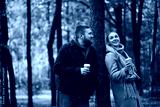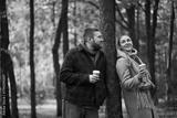 Caucasian young man and Caucasian young woman standing in autumn forest holding takeaway coffee cups, leaning against tree, smiling and looking at each other, wearing warm clothing