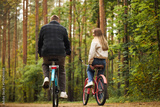 Caucasian young man and Caucasian young woman riding bicycles together on forest path, both seen from behind, enjoying outdoor activity surrounded by tall trees and autumn foliage