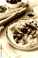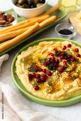 Delight in a classic hummus dish topped with pomegranate seeds, served alongside a variety of cheeses, nuts, and breadsticks perfect for sharing during gatherings
