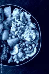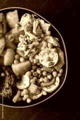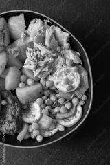 This hearty breakfast showcases a plate filled with baked sweet potatoes, carrots, zucchini, lentil cutlets, chicken breast