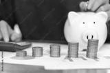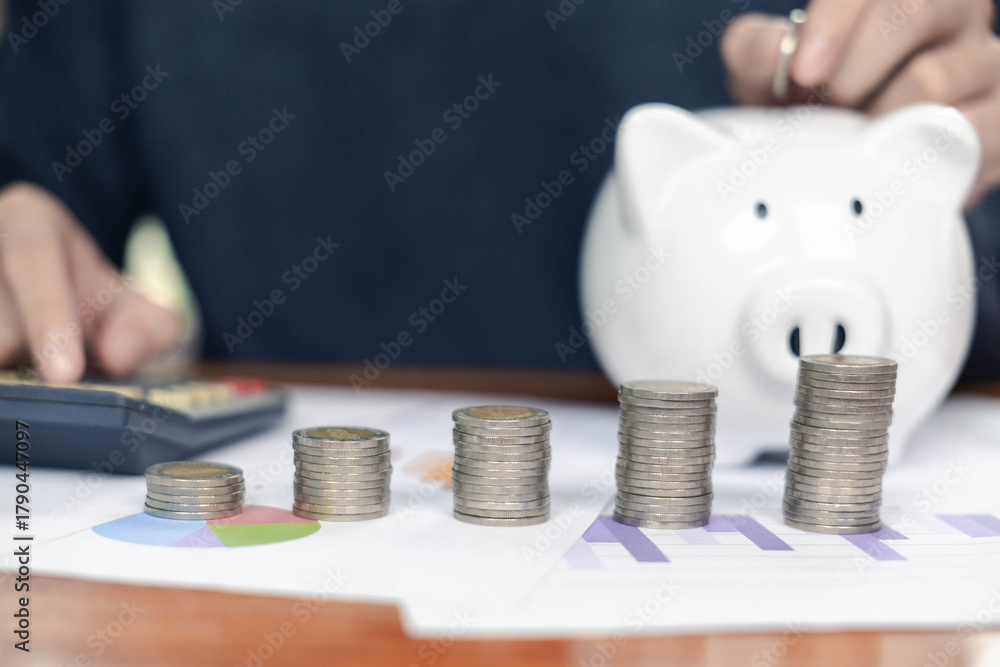 man hand putting coins in a piggy bank for an account saving money. Concept of Business investment, Financial planning, wealth, and tax. growth funds to maximize profits, and emergency investments