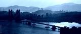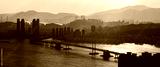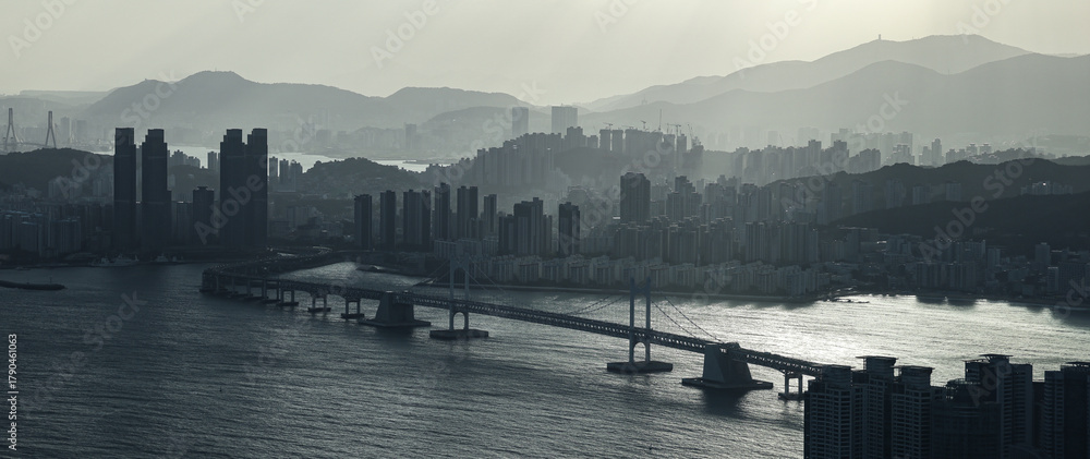 Busan skyline with mountains and Gwangandaegyo Bridge reflecting light on ocean