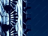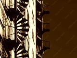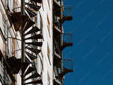 Close-up of exterior rusted spiral fire escape stairs on a white building against a clear blue sky.