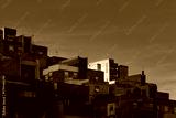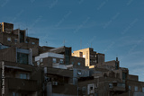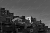 Facade of a terraced brutalist concrete residential building in Belgrade against a vast blue sky.