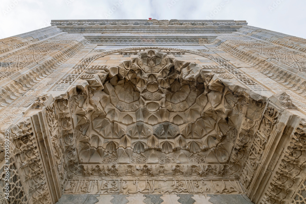 A detail of the monumental gateway of the Sultanhani Caravanserai, Türkiye