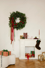 Minimalist Christmas living room with a large green wreath, white mantel, candles, and wrapped presents in red and green tones.
