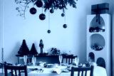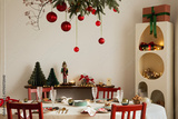 Christmas dining room with red chairs, decorated table, and hanging evergreen branches with red ornaments.