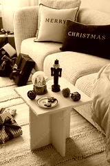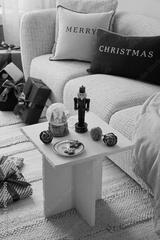 Elegant Christmas scene with a small table, nutcracker, snow globe, and festive cookies near a cozy sofa.