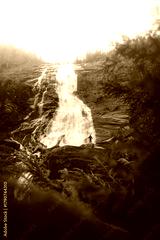 Person standing below powerful Reiarsfossen waterfall in Setesdal Valley, Norway. Dramatic scene showing human scale against raw Nordic nature and water energy
