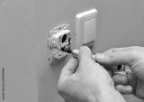 Electrician master installs a wireless switch on the wall close-up of handyman hands