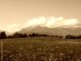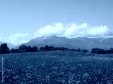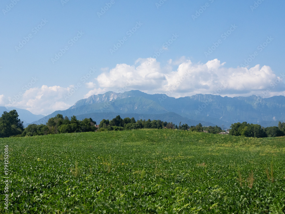Udinese, Italy - July 29th 2024: View over agricultural fields and forests towards the Southern Alps